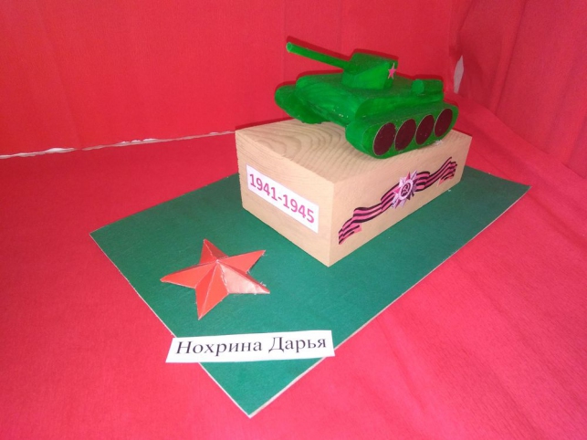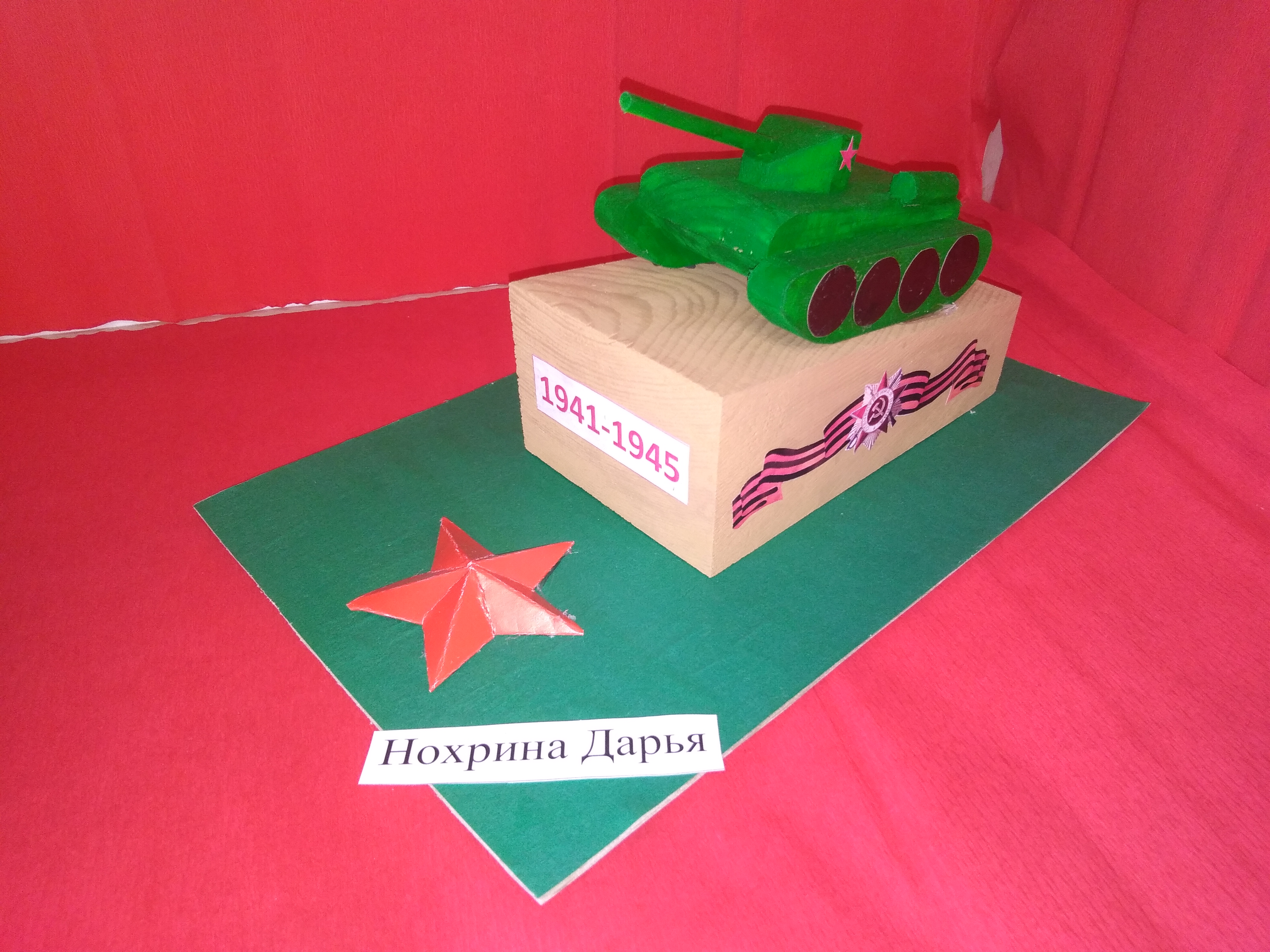 Он являлся самым массовым танком Второй мировой войныи послевоенного времени. Поделка танк и постамент вырезаны из дерева и установлены на подставке из картона. Перед постаментом расположена объёмная красная звезда. На передней части постамента цифры «1941-1945», сбоку георгиевская лента с орденом «Красной звезды» в центре.