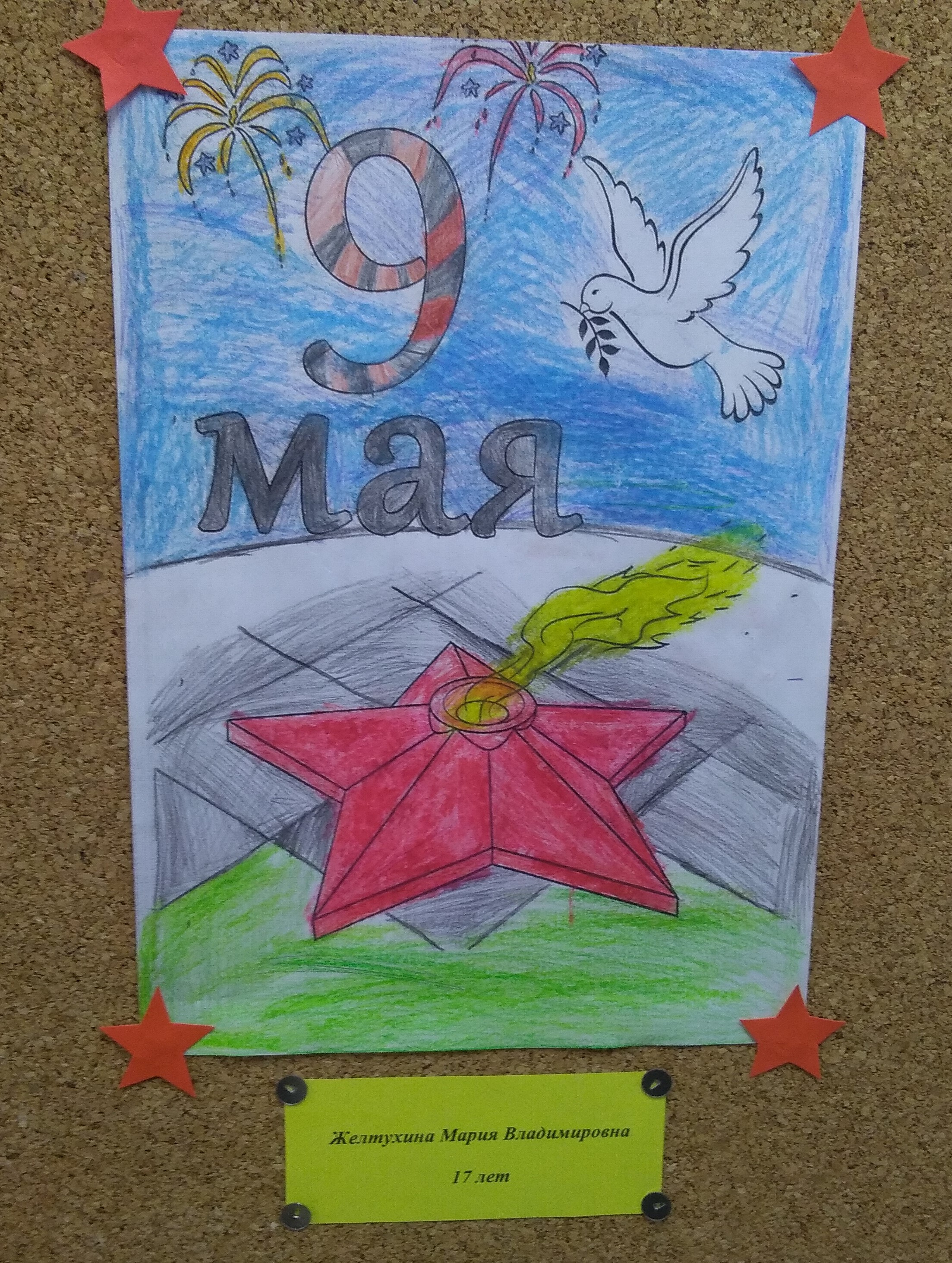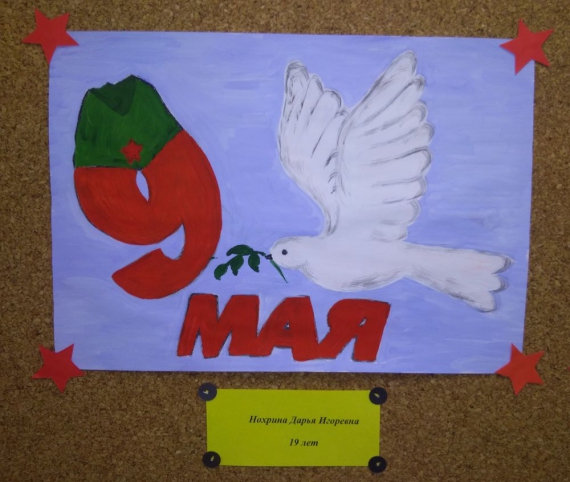 Рисунок на альбомном листе. На голубом фоне надпись красного цвета «9 мая» с надетой зелёной пилоткой на цифре 9 и белый большой летящий голубь с зеленой веточкой в клюве символизирующий мир на земле.