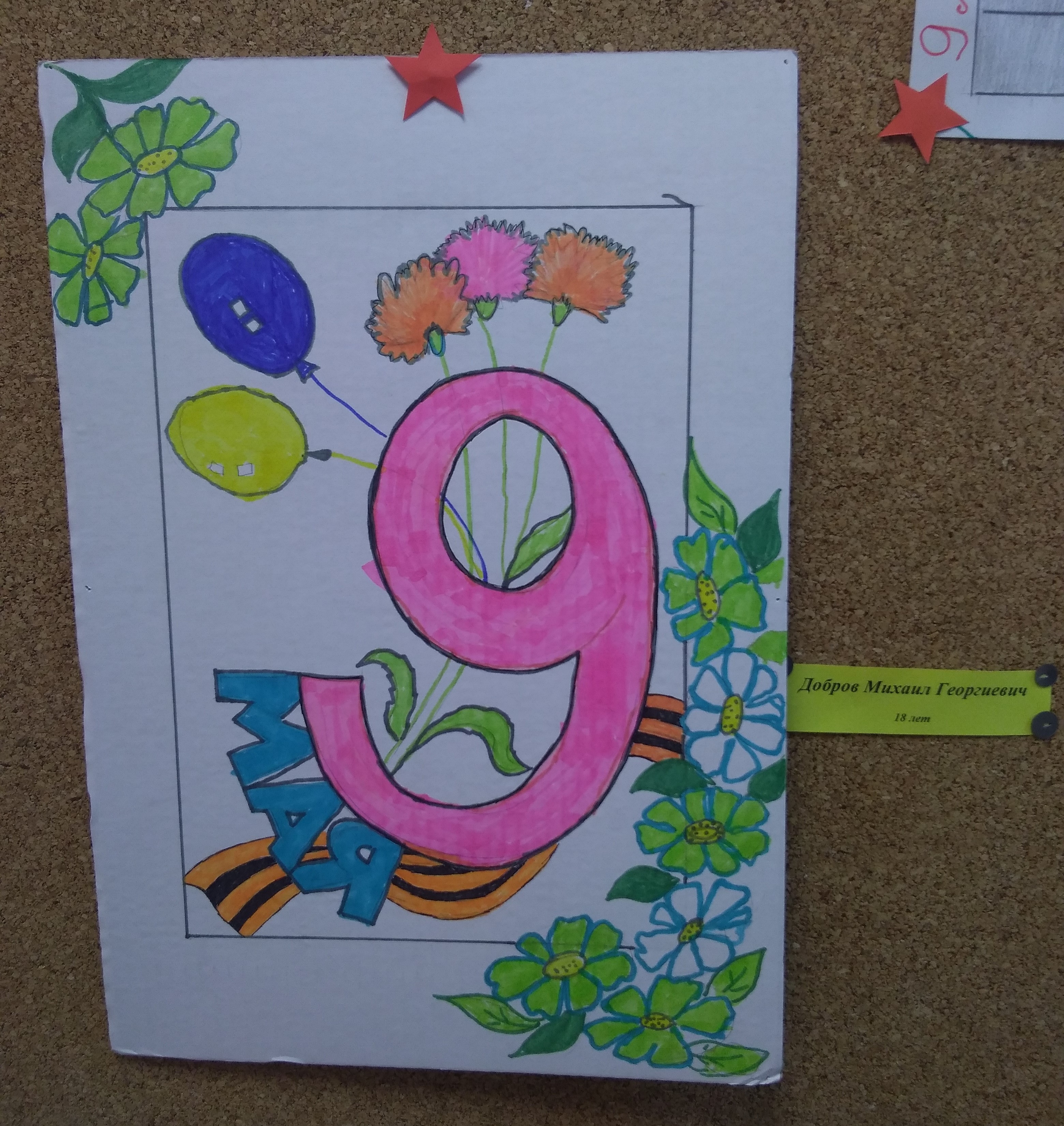 Рисунок выполнен на картоне. В центре розовая цифра «9» и голубое слово «мая» расположенные на георгиевской ленте. В небе желтый и синий шары и 3 гвоздики. Гвоздика является символом Победы. С давних пор этот цветок ассоциируется со стойкостью. Участник выставки шарами символизировал праздник великой победы. Данный рисунок окантован белой рамкой, по нижнему правому углу которой нарисованы белые и светло-зелёные цветы с желтыми серединками и листочки, такие же 2 зелёных цветка расположены в противоположном левом верхнем углу.