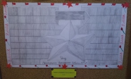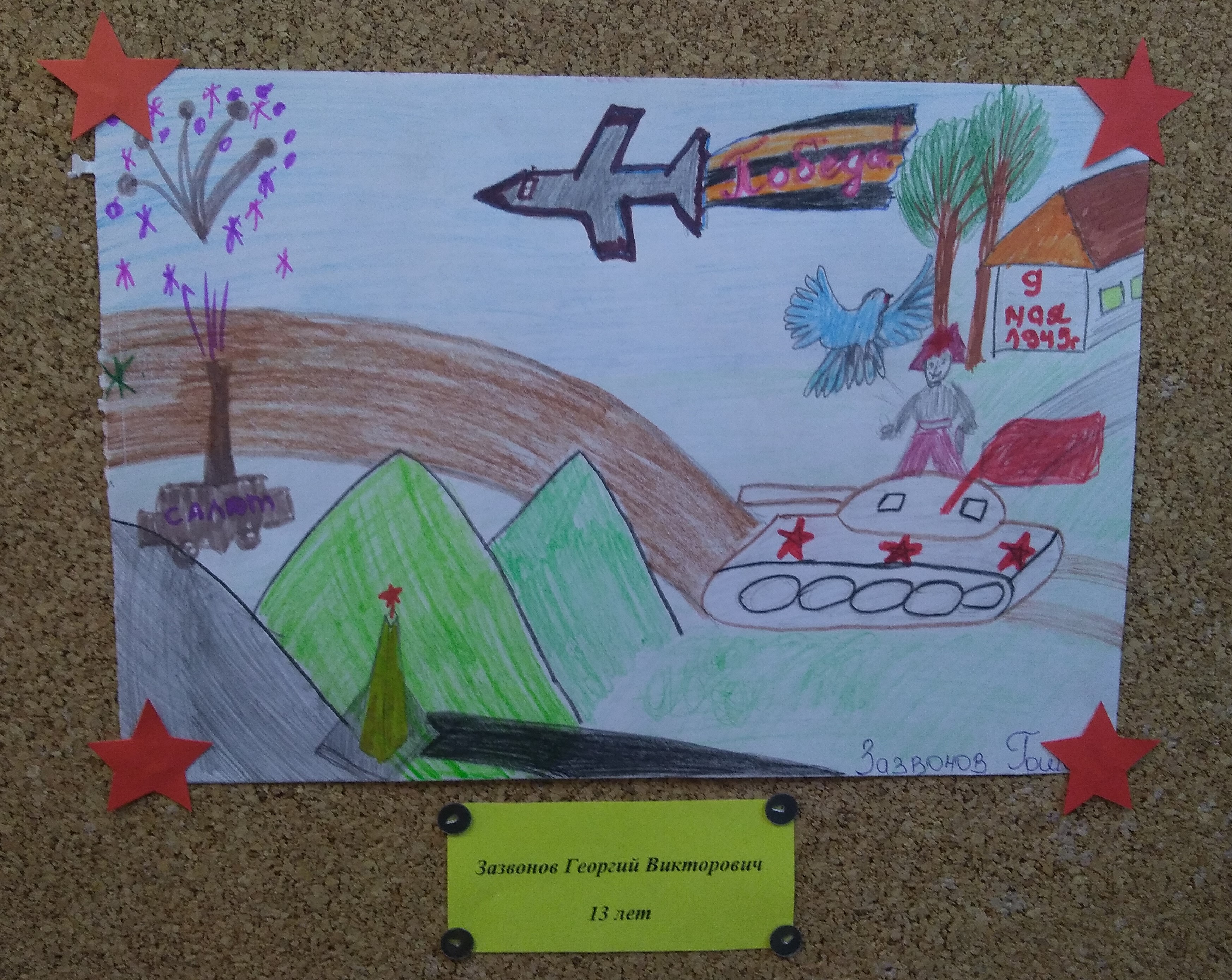 Рисунок на листе формата А4 изображено празднование 9 мая! В центре рисунка расположена дорога по которой едет танк со звездой на корпусе и красным флагом прикрепленном на башне, за танком стоит человек выпускающий в небо голубя, в небе летит самолет с развивающейся георгиевской лентой на которой надпись «Победа!», в правой части картины расположено здание с коричневой крышей и надписью на торцевой части «9 мая 1945 г.» В левой части картины нарисованы горы, в горох стоит памятник неизвестному солдату со звездой. За горами находится машина, запускающая в небо салют. Георгиевская ленточка— символ Победы, воинской славы, отваги, мужества.