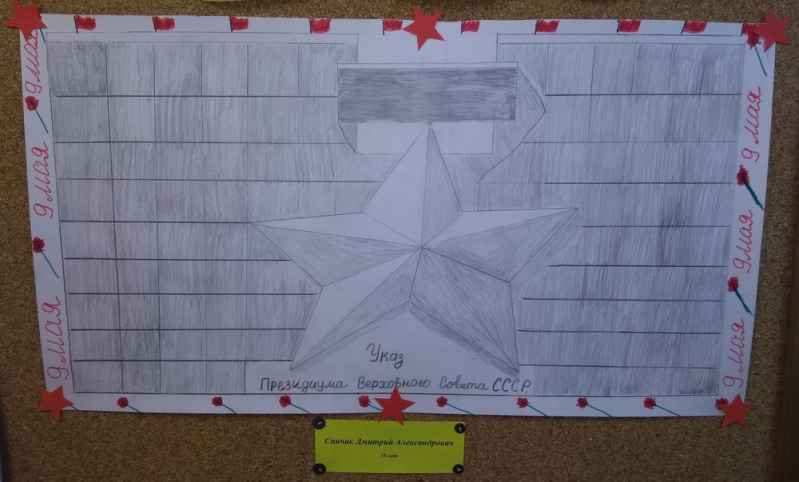 Рисунок выполнен на листе формата А3 простым карандашом. На рисунке в центре изображена медаль «Золотая Звезда Героя Советского Союза» - высшая степень отличия в СССР, которой удостаивали за совершение подвига или выдающиеся заслуги во время боевых действий, расположенная на кирпичной стене. Под медалью надпись «Указ Президиума Верховного Совета СССР». Рамка рисунка оформлена повторяющимися элементами: сверху – красными флажками, снизу – красными маленькими гвоздиками, по бокам – гвоздиками и надписями «9 мая» (флаги, головки гвоздик и надписи сделаны красным карандашом). Звание Героя Советского Союза впервые установлено Постановлением ЦИК СССР от 16 апреля 1934 года, дополнительный знак отличия для Героя Советского Союза—медаль «Золотая Звезда» учреждена Указом Президиума Верховного Совета СССР от 1 августа 1939 года.