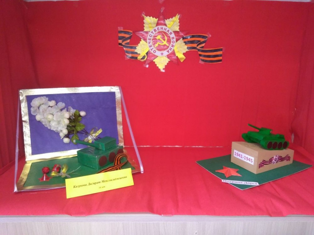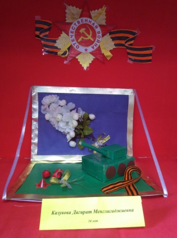 Двойная открытка из картона. Танк из бумаги стоит на картонной основе, зеленного цвета, окантовка края нижней части открытки золотой лентой, а верхней части серебряной лентой с фиолетовым фоном. Перед танком нарисован звезда, изображающая «Вечный огонь» с возложенными красными цветами, перевязанными светло-зелёным бантом, на вертикальной части открытки расположена цветущая ветка белых цветов со светло-зелёным бантом на стволе. На стене над открыткой расположены вырезанные из бумаги георгиевская лента и орден «Красной звезды»