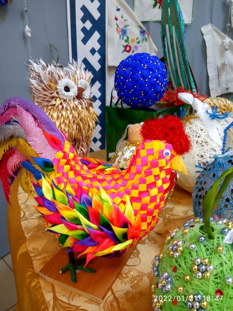 Работы Севастьяновой Марзии «Сова» и « Курица» выполнены в технике ДПИ из атласных лент и фоамирана разных ярких цветов: ярко-малиновый, жёлтый, серо-жёлтого.
