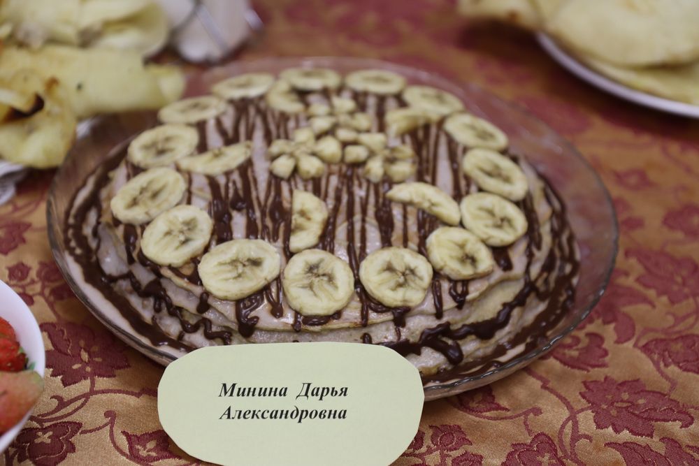 Торт из блинов, украшенный политым тёмным шоколадом и кусочками бананов