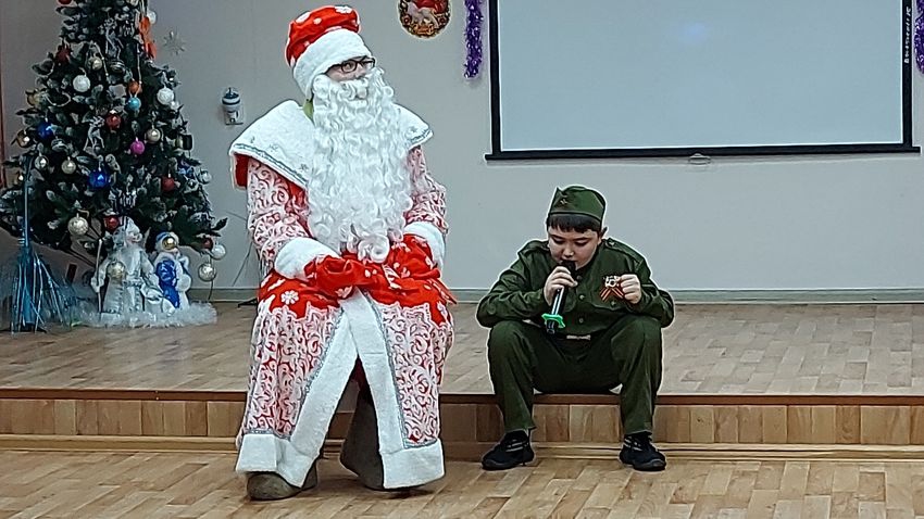 Дедушка Мороз устал и присел отдохнуть, ребенок в костюме солдата рассказывает стихотворение.