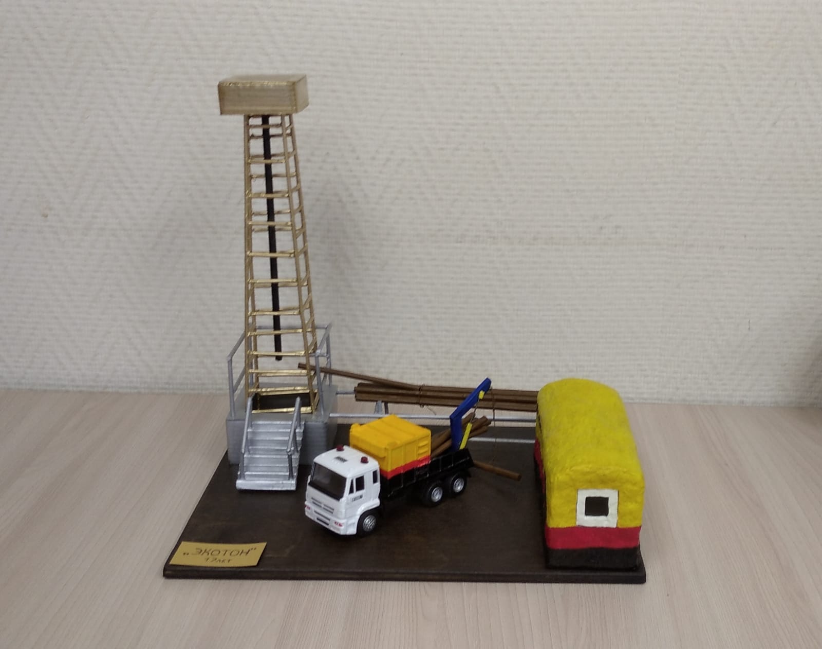 В честь 17-летия ООО «Экотон» в нашей «Творческой мастерской» руками членов организации сделан подарок в виде поделки, на которой изображена буровая вышка, вахтовый вагончик, технический грузовик, оборудованный будкой и подъёмником (вагончик и автомобиль выкрашены в цвета компании – желтый, красный и черный), рядом лежат нефтяные трубы.