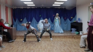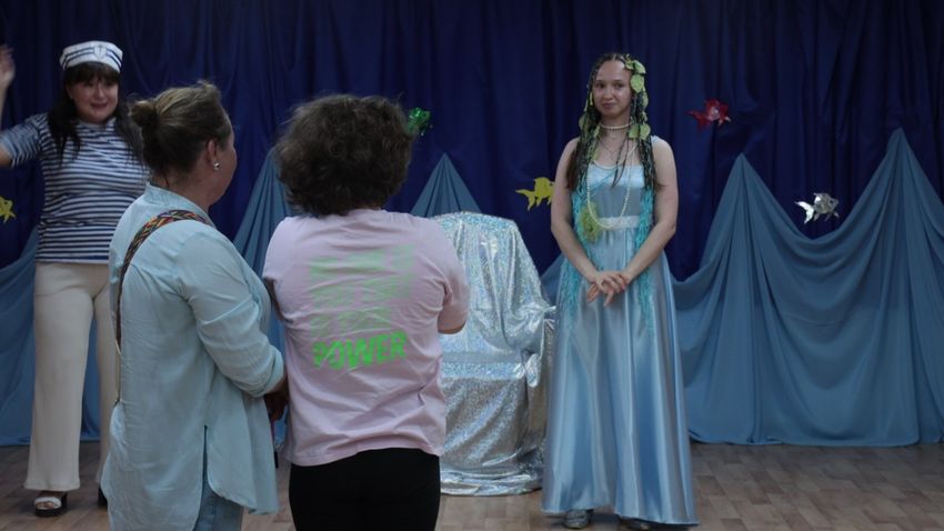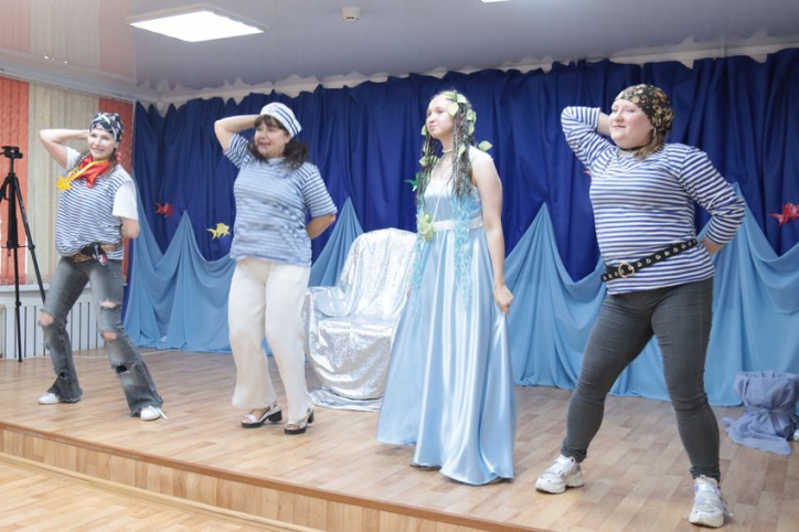 На сцену выходит русалка из подводного царства она вместе с детьми зовёт своего дедушку – Царя Нептуна.