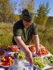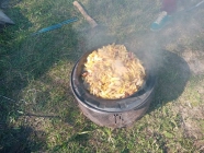 На этих мы видим процесс приготовления ухи и жаренного картофеля. Женщины накрывают на стол.