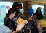 После всех пройденных испытаний все пришвартовались у пиратского накрытого стола, где был организован легкий перекус пиццей и соком.