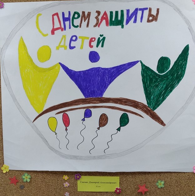 Рисунок выполнен на белом ватмане, раскрашен фломастерами желтыми, синими, зелеными, коричневыми цветами. В центре дети держатся за руки ниже детей, летящие шары как символ мира и праздника. В верхней части цветная надпись «С ДНЕМ ЗАЩИТЫ ДЕТЕЙ».