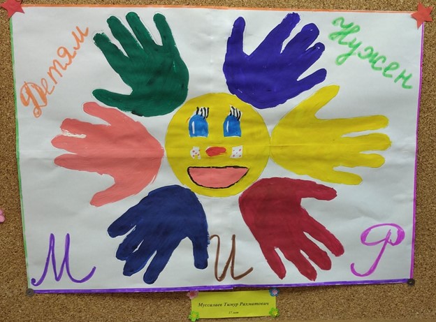 На рисунке изображено солнышко с ладошками выполнен на белом холсте красками и фломастерами синего, желтого, зеленого, красного, розового цвета и надписи в левом верхнем углу слово «Детям», в правом верхнем слово «Нужен» и внизу буквы «МИР» по одной в углах и центре.