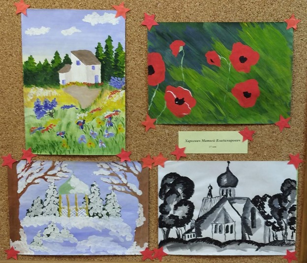 Четыре рисунка выполнены на альбомных листах бумаги, нарисованы гуашью. На всех рисунках изображены пейзажи. 1 рисунок: на фоне леса стоит белый дом с голубыми окнами и коричневой крышей, на переднем фоне дорога и желто-зеленая поляна, усыпанная цветами. 2 рисунок: красные маки на фоне зеленой травы. 3 рисунок: зимний пейзаж бело-голубого фона в центре беседка рядом заснеженные зеленые ели, на переднем фоне по бокам высокие деревья коричневого цвета с заснеженными белыми ветками. 4 рисунок: выполнен в бело-черных тонах в центре рисунка церковь по богам высокие деревья. Своими рисунками дети выразили благодарность от всех нас за светлое и счастливое будущее!