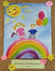 На рисунке изображена радуга, на радуге стоят мальчик с шарами в левой руке (в синей футболке и серых штанах), девочка в розовом платье с российским флагом в правой руке. В голубом небе светит солнышко. Рисунок нарисован на альбомном листе, разукрашен красками розового, желтого, оранжевого, зеленого, фиолетового, голубого цвета.
