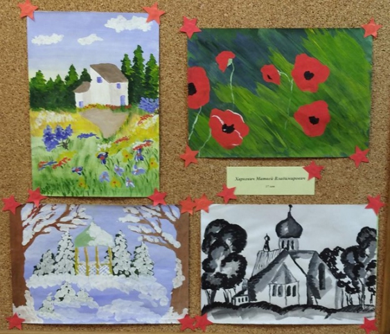 Четыре рисунка выполнены на альбомных листах бумаги, нарисованы гуашью. На всех рисунках изображены пейзажи. 1 рисунок: на фоне леса стоит белый дом с голубыми окнами и коричневой крышей, на переднем фоне дорога и желто-зеленая поляна, усыпанная цветами. 2 рисунок: красные маки на фоне зеленой травы. 3 рисунок: зимний пейзаж бело-голубого фона в центре беседка рядом заснеженные зеленые ели, на переднем фоне по бокам высокие деревья коричневого цвета с заснеженными белыми ветками. 4 рисунок: выполнен в бело-черных тонах в центре рисунка церковь по богам высокие деревья. Своими рисунками дети выразили благодарность от всех нас за светлое и счастливое будущее!