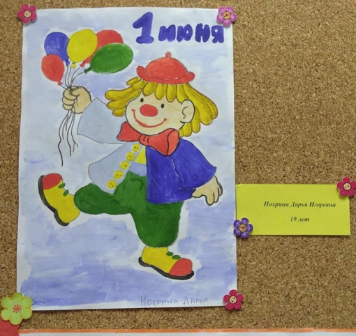 Рисунок клоуна с воздушными шарами нарисован на белом листе формата А4, разукрашен красками синего, желтого, красного и зеленого цвета. В верхней части надпись «1 июня».