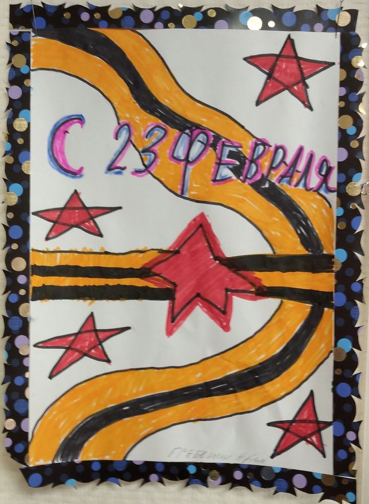 Открытка «Звезды на георгиевской ленте» выполнена на листе А4 белого цвета разукрашена фломастерами красного, черного, оранжевого цвета с надписью 23 февраля.