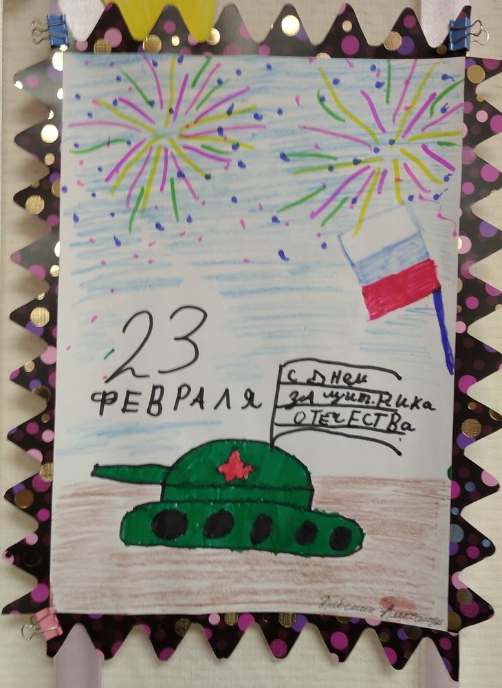 Открытка «С Днем защитника Отечества» работа выполнена на листе формата А4 танк под праздничным салютом с надписью 23 февраля и с флагом на танке с днем защитника отечества, разукрашено карандашами и фломастерами. Разноцветный салют и танк зеленого цвета с красной звездой, флагом России.
