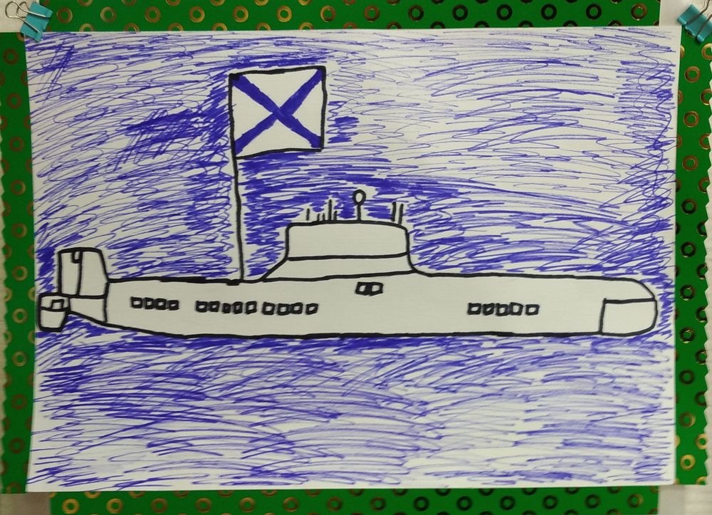 Открытка «Морской флот» выполнена на листе белого цвета формата А4, на синем море всплыла белая подводная лодка с флагом морского флота.