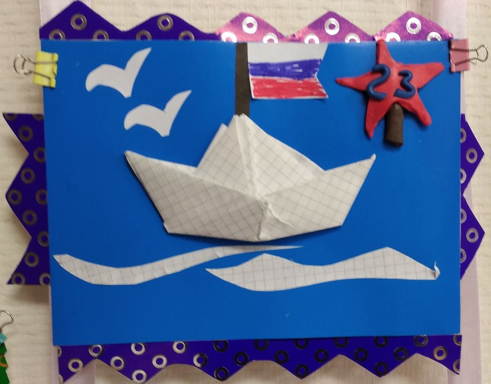 Открытка-аппликация «Кораблик на волнах» выполнен на голубом картоне объёмный кораблик плывёт по волнам в технике оригами с Российским флагом на флагштоке вокруг парят чайки, в правом верхнем углу красная звезда с изображением цифр 23 (сделанная из пластилина).