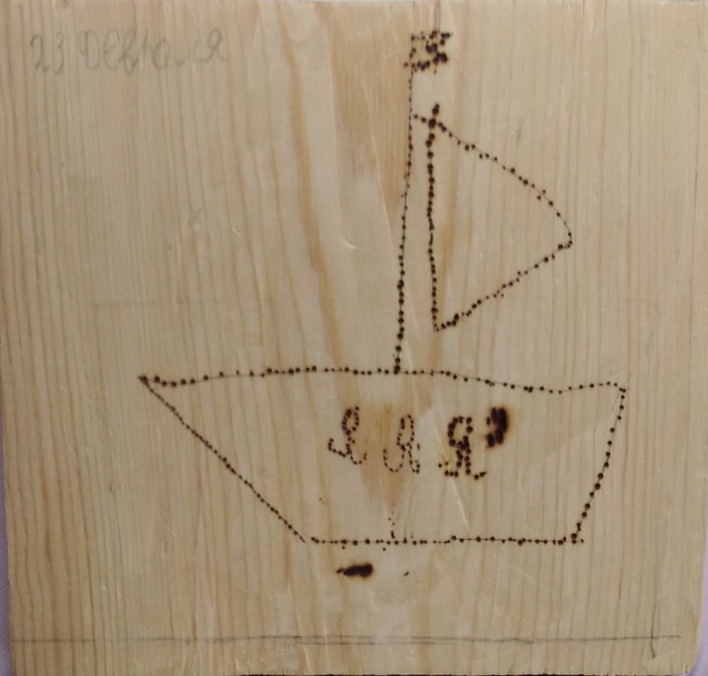 Изделие на деревянной доске «Кораблик». Рисунок выполнен с помощью выжигателя. Кораблик с парусом название на корме ЯЯЯ.