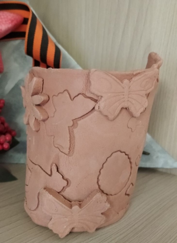Ваза из глины светло-коричневого цвета с фигурками как плоских, так и объёмных бабочек, лошадей, ажурных кругов, цветов.