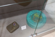 На этом фото две шкатулки из папье-маше. Большая круглая шкатулка бирюзового цвета с рисунком черепахи на крышке (диаметр 35, высота 15). Слева коричневая прямоугольная со скругленными углами шкатулка с изображением пера павлина на крышке (длинна 20х15х10 см).