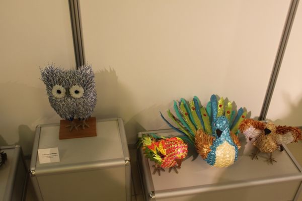 Работы, выполнены в технике ДПИ. Слева «Сова» изготовлена из бело –синих атласных лент, глазки из черных больших бусинок и вокруг них опушение из белого фоамирана, клюв из серого фоамирана. Лапки сделаны из проволоки, оплетённой джутовыми нитками коричневого цвета. «Попугай» сделан из красных и жёлтых атласных лент, оперение использованы желтые, зелёные цвета. «Павлин» сделан из атласных лент разных цветов: голова из синих, грудка желтая, крылья из светло-коричневых, хвост из синих, бирюзовых и жёлтых цветов, клюв из кусочка черного фоамирана.
