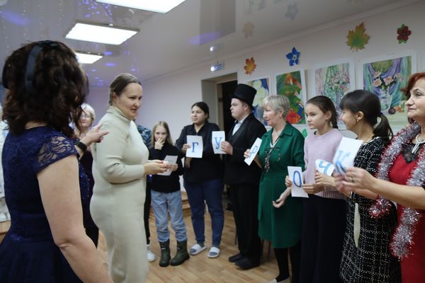 После такого необычного подарка на сцену вызвали Снегурочку в исполнении Евгении Аман. Она провела с присутствующими игру, которая так и называлась «Снегурочка». Каждому участнику вручалась одна буква и необходимо было построится с буквами, правильно, в задуманное слово.